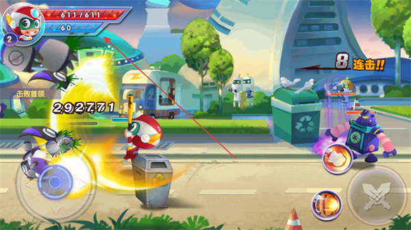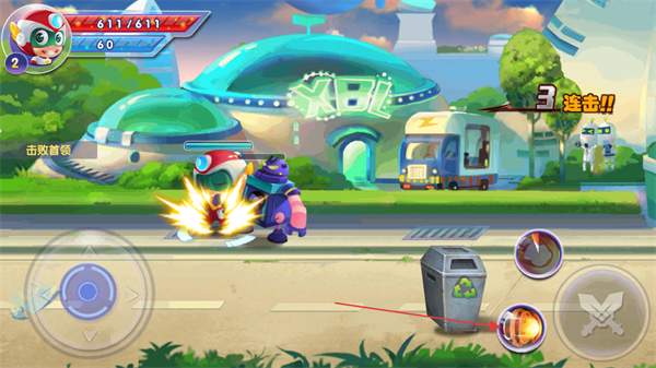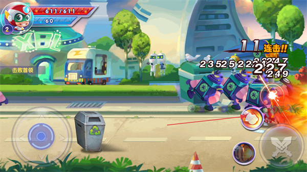 1、留意屏幕左上角開心超人的生命值611/611和能量值60,通過左下方虛擬搖桿控制角色移動走位。
