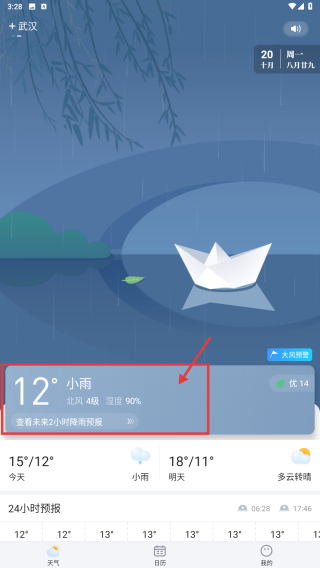 4、添加完成后,查看武漢市的天氣信息,當前溫度為12°,天氣小雨,北風4級,濕度90%。