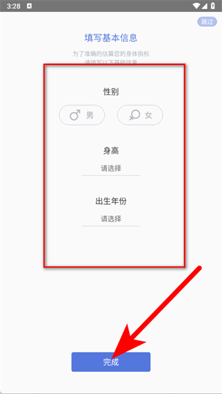 1、打開(kāi)體重記錄,進(jìn)入填寫(xiě)基本信息頁(yè)面,選擇性別等信息后,點(diǎn)擊完成按鈕。
