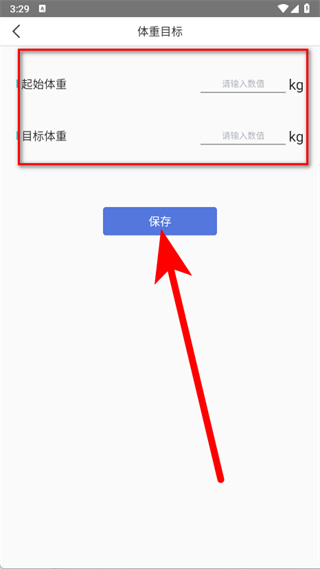 4、分別輸入起始體重和目標(biāo)體重的數(shù)值,點(diǎn)擊保存,完成體重目標(biāo)設(shè)置。