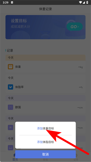 3、在彈出的選項(xiàng)中,選擇添加體重目標(biāo),進(jìn)入體重目標(biāo)頁(yè)面。
