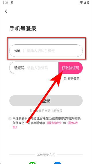 2、進入手機號登錄頁面,填寫手機號碼并點擊獲取驗證碼。