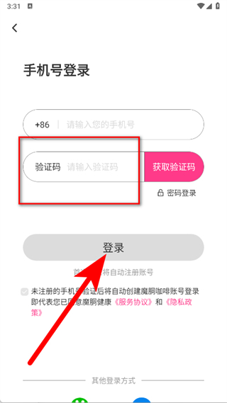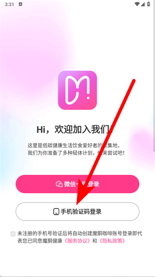 1、打開魔胴健康飲食,在歡迎頁面直接點擊手機驗證碼登錄選項。