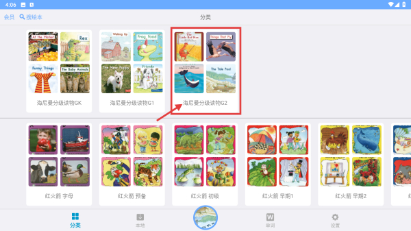 1、打開繪本類應(yīng)用,在分類頁(yè)面選擇海尼曼分級(jí)讀物G2分類,進(jìn)入該分類的繪本列表。