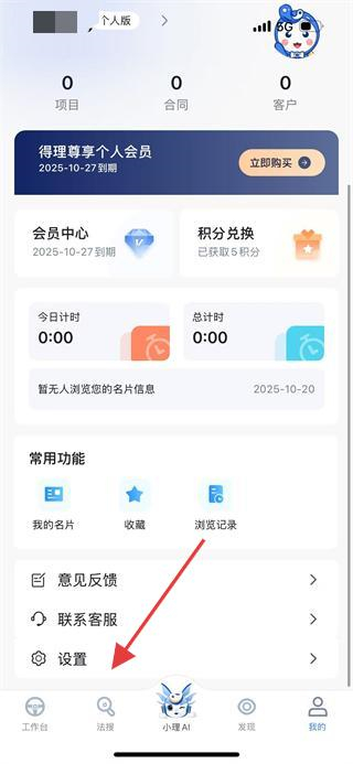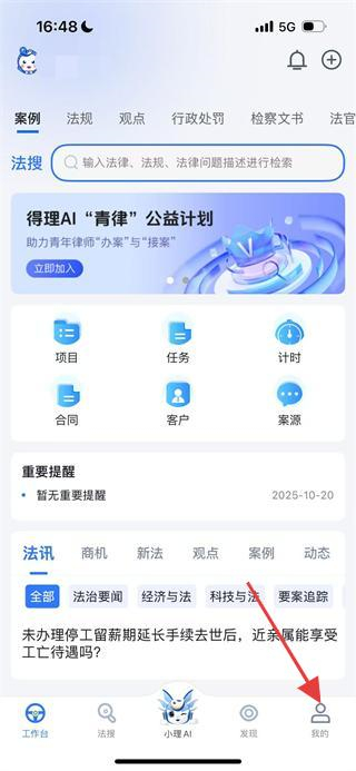 1、進入得理法搜,在工作臺頁面點擊底部我的,進入個人頁面。