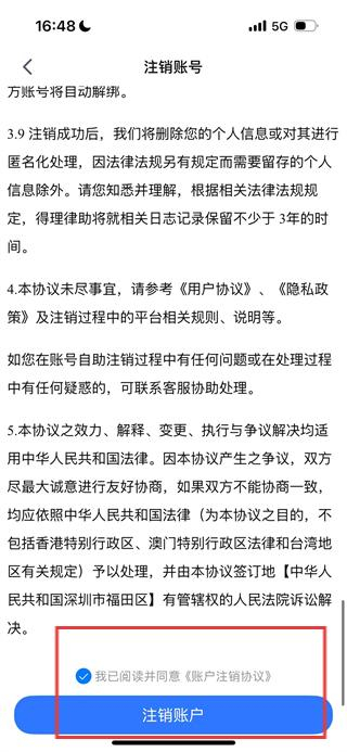 4、在注銷賬號頁面,同意協(xié)議后,點擊注銷賬戶,即可注銷賬號。