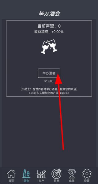 3、花費一定資金舉辦酒會,舉辦后能提高聲望,進而帶來收益加成,助力更好地賺錢。