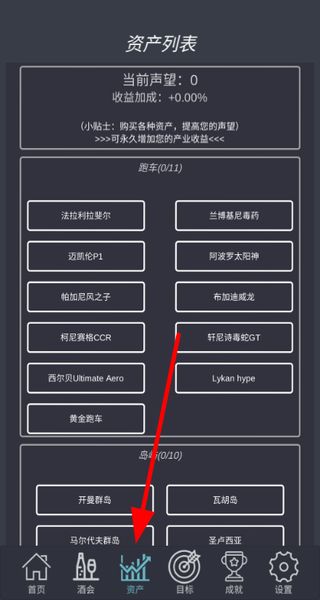4、查看資產(chǎn)列表,里面有各類資產(chǎn),購買不同資產(chǎn)可提高聲望,還能永久增加產(chǎn)業(yè)收益。