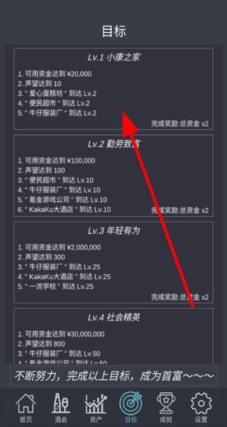 2、查看目標(biāo)列表,里面有不同等級(jí)的目標(biāo),完成對(duì)應(yīng)目標(biāo)能獲得總資金翻倍等獎(jiǎng)勵(lì)。