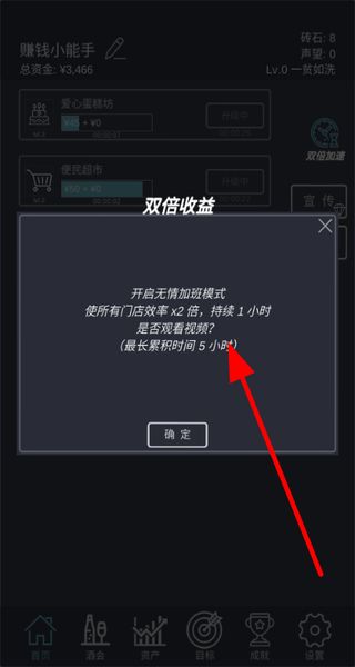4、能開(kāi)啟雙倍收益模式,看免廣告視頻后,所有門(mén)店效率會(huì)翻倍,持續(xù)1小時(shí),助力更快賺錢(qián)。