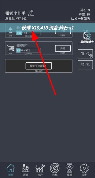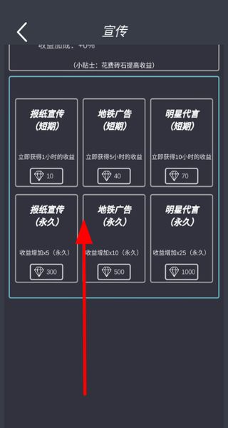 4、玩家進(jìn)行宣傳操作,花費鉆石選擇不同的宣傳方式,能立即獲取收益或永久增加收益。