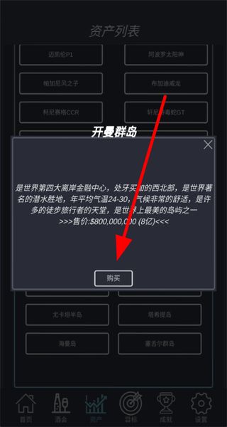 2、在資產(chǎn)列表中,可以隨意花費資金購買各類資產(chǎn),像開曼群島等,購買后助力提升收益。