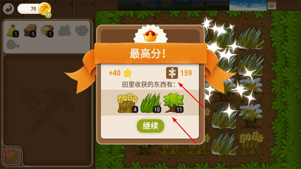 2、收割農田獲取小麥、草料等資源,獲得高分和星星獎勵,提升農場等級。