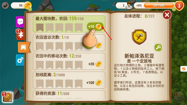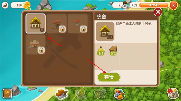 4、建造農場設施,為工人提供住所,持續(xù)收割資源、完成成就、建造設施。