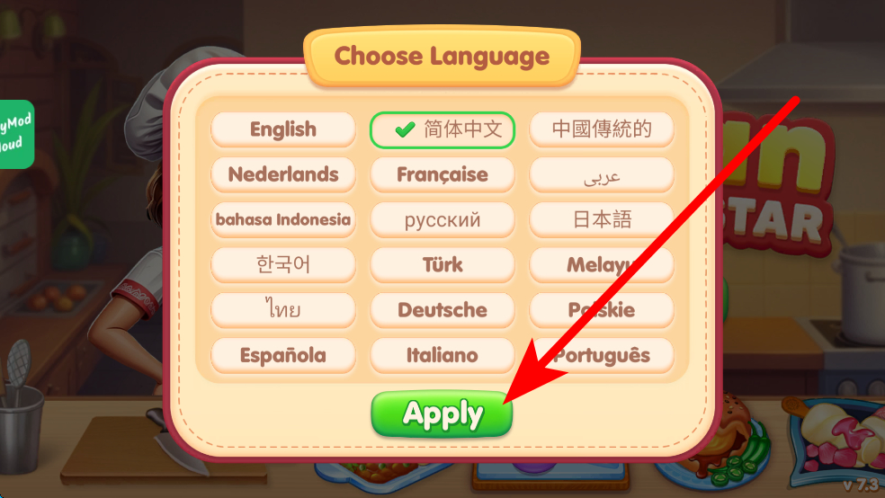 1、進(jìn)入游戲,會出現(xiàn)語言選擇界面,有多種語言選項,選擇好后點擊確認(rèn)按鈕,即可進(jìn)入游戲主界面,開始美食經(jīng)營之旅。