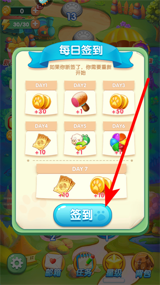 1、在每日簽到界面,能看到不同天數(shù)對(duì)應(yīng)的獎(jiǎng)勵(lì),有金幣、道具等,點(diǎn)擊簽到按鈕,即可領(lǐng)取當(dāng)日獎(jiǎng)勵(lì),若斷簽則需重新開(kāi)始簽到周期。