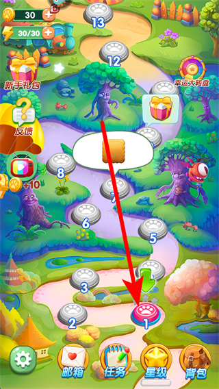 2、進(jìn)入游戲后,界面會(huì)顯示帶有數(shù)字編號(hào)的關(guān)卡按鈕,點(diǎn)擊帶有箭頭指向的關(guān)卡按鈕,即可進(jìn)入對(duì)應(yīng)關(guān)卡開(kāi)始游戲,開(kāi)啟消除挑戰(zhàn)之旅。