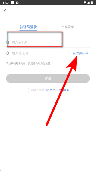 3、在驗證碼登錄頁面,輸入手機號,點擊獲取驗證碼。