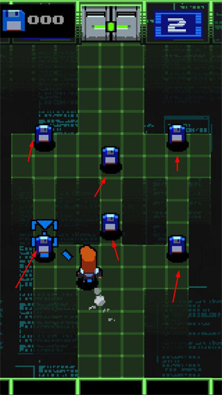 1、在網(wǎng)格地圖中收集藍色設(shè)備,獲取資源或解鎖新區(qū)域,同時躲避敵人。