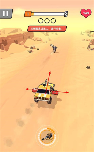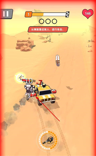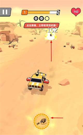 3、點(diǎn)擊屏幕使用武器攻擊敵人車(chē)輛,消滅敵人獲取分?jǐn)?shù)和獎(jiǎng)勵(lì)。