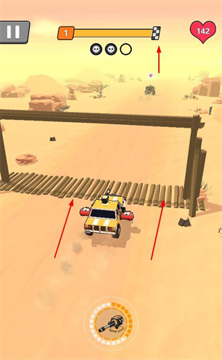 1、駕駛車(chē)輛在沙漠賽道行駛,穿越木橋等地形,朝著終點(diǎn)前進(jìn)。