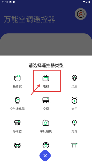 2、在遙控器類型選擇界面,點(diǎn)擊電視選項(xiàng),進(jìn)入品牌選擇頁面。