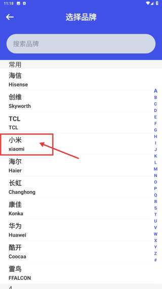 3、在品牌選擇頁面,選擇小米品牌,進(jìn)入小米電視遙控器對(duì)碼頁面。
