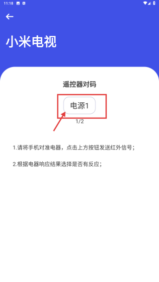 4、在小米電視遙控器對(duì)碼頁面,將手機(jī)對(duì)準(zhǔn)電視,點(diǎn)擊電源1按鈕發(fā)送紅外信號(hào),根據(jù)電視響應(yīng)結(jié)果完成對(duì)碼操作,從而實(shí)現(xiàn)對(duì)小米電視的遙控。
