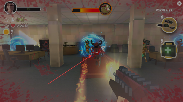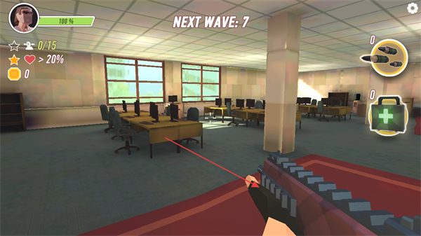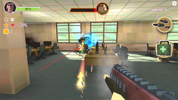 以辦公室為主要戰(zhàn)斗場景,還原辦公桌、文件柜、電梯等元素,僵尸會從走廊、會議室等不同區(qū)域出現(xiàn),場景代入感強烈。