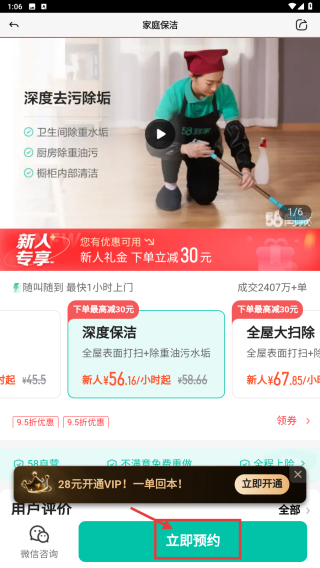 4、在深度保潔服務詳情頁面,點擊“立即預約”按鈕,即可預約深度保潔服務櫥柜內部清潔等,新人還可享受立減30元的優(yōu)惠。
