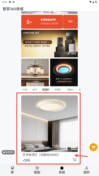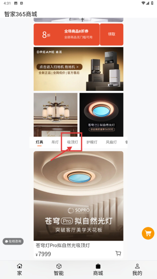 2、在商城頁(yè)面,點(diǎn)擊吸頂燈分類,進(jìn)入吸頂燈商品列表。