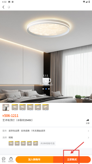 4、在商品詳情頁(yè)面,點(diǎn)擊立即購(gòu)買按鈕,即可進(jìn)行該吸頂燈的購(gòu)買操作,該商品價(jià)格為¥506-1211,并有多種規(guī)格可選。