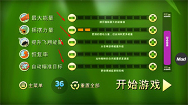 3、升級(jí)屬性如最大能量、抬升力量等,提升昆蟲飛行能力,優(yōu)化游戲體驗(yàn)。