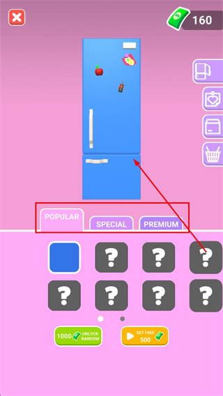2、在冰箱選擇界面,可選擇POPULAR、SPECIAL、PREMIUM等不同分類的冰箱樣式,花費(fèi)金幣解鎖喜歡的冰箱。