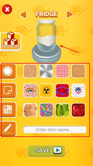 1、進(jìn)入游戲后,可進(jìn)入冰箱定制界面,選擇不同的材質(zhì)、圖案、貼紙等,設(shè)計(jì)完成后點(diǎn)擊SAVE保存。