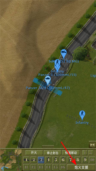 1、進(jìn)入戰(zhàn)斗界面后,點(diǎn)擊炮火支援按鈕,這是發(fā)起火力壓制的關(guān)鍵操作,準(zhǔn)確點(diǎn)擊可對敵方區(qū)域?qū)嵤┡诨鸶采w,削弱敵方戰(zhàn)力。