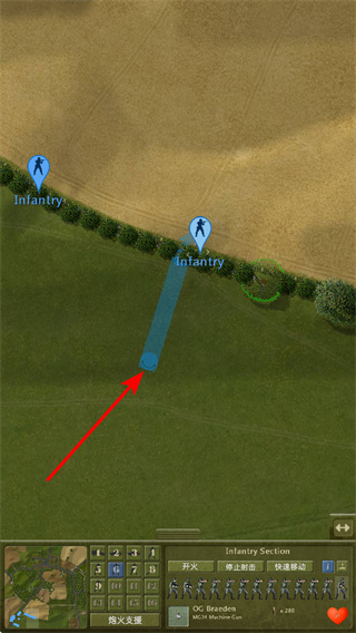 3、操控步兵單位時(shí),點(diǎn)擊帶有紅色箭頭的移動(dòng)路徑,讓步兵沿指定路線推進(jìn),移動(dòng)時(shí)需結(jié)合地形,利用掩體提升生存能力。