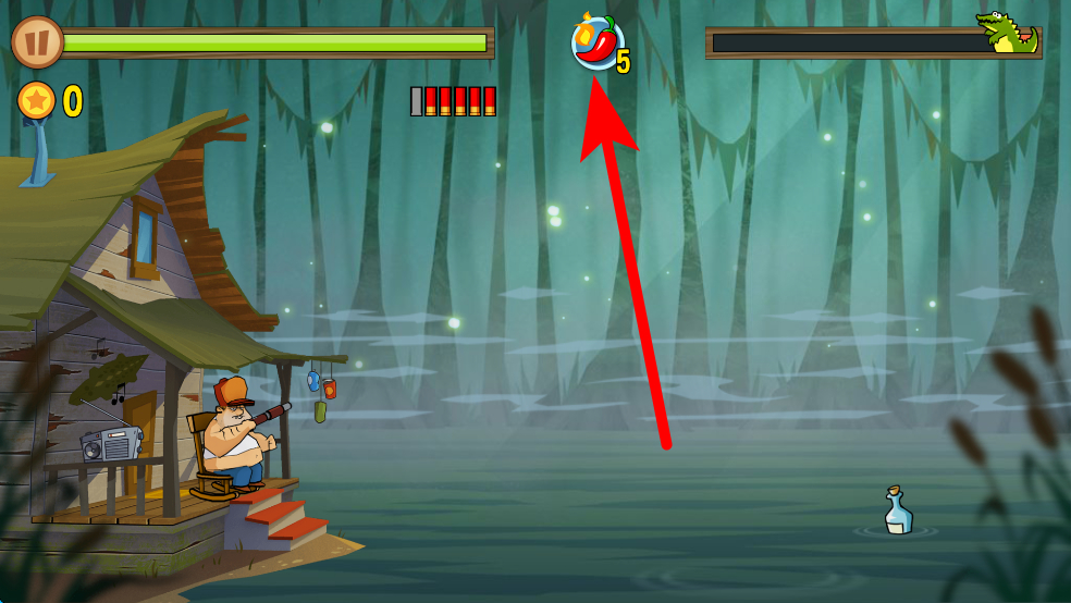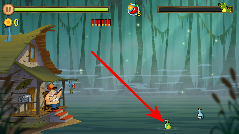 1、射擊敵人,操控角色使用武器射擊沼澤中的鱷魚等敵人,精準命中可快速削減敵人血量,完成關卡目標。