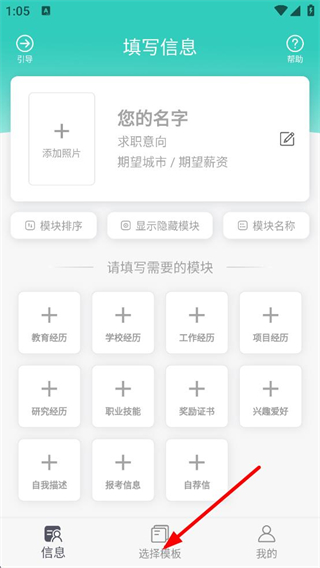 1、在APP首頁,點擊底部選擇模板,進入模板選擇頁面。