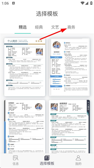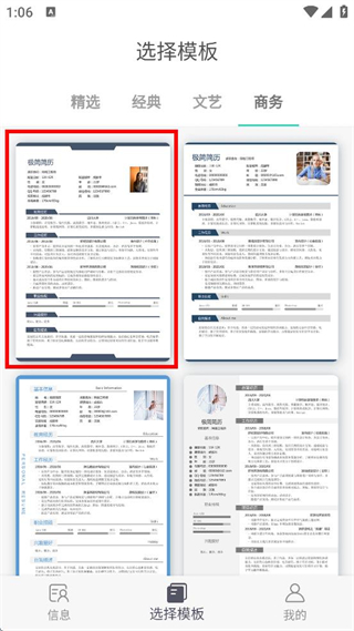 3、在商務(wù)風格模板列表頁面,選擇想要使用的簡歷模板,即可應(yīng)用該模板制作簡歷。