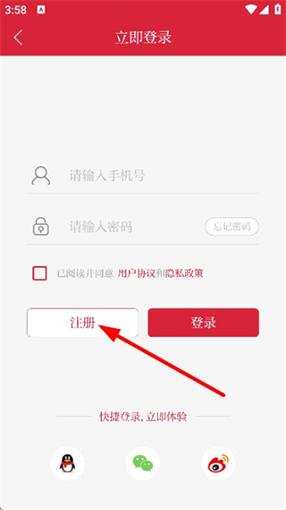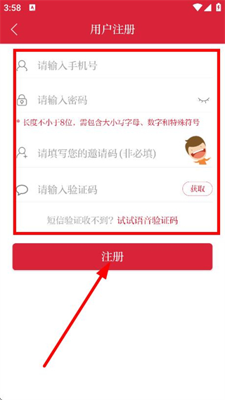 4、輸入手機號、密碼、驗證碼后,點擊注冊,完成賬號注冊。