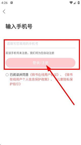 2、在輸入手機號頁面,輸入手機號,勾選同意后,點擊登錄/注冊。