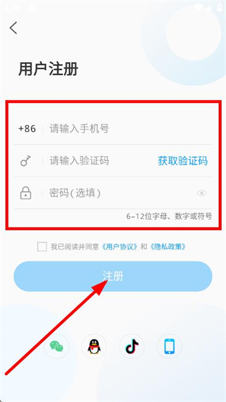 4、輸入手機(jī)號、驗(yàn)證碼、密碼,點(diǎn)擊注冊,完成賬號注冊。