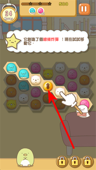 2、進(jìn)入關(guān)卡后,界面有六邊形萌寵圖案,需移動(dòng)圖案讓三個(gè)及以上同色萌寵連成一線,即可消除,消除后會(huì)獲得分?jǐn)?shù),關(guān)卡有分?jǐn)?shù)目標(biāo),達(dá)到即可通關(guān)。