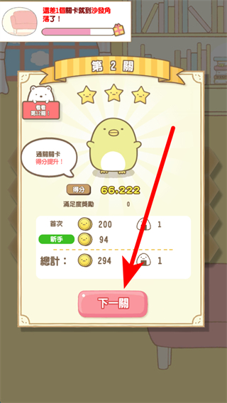 3、通關(guān)后會(huì)顯示得分、獎(jiǎng)勵(lì),可解鎖新關(guān)卡;界面上方有星星評(píng)價(jià),分?jǐn)?shù)越高星星越多,收集星星可解鎖額外獎(jiǎng)勵(lì)與新內(nèi)容。