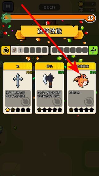 2、游戲過(guò)程中會(huì)出現(xiàn)技能選擇界面,可選擇叉、斧頭、灼燒貓等技能,這些技能能增強(qiáng)角色的攻擊方式,助力更快消滅怪物。