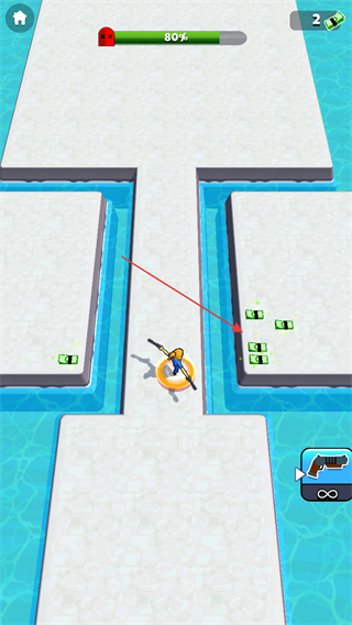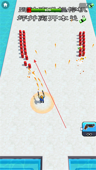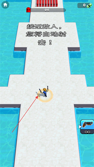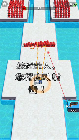 1、操控角色在賽道上移動,接近敵人時會自動射擊,消滅紅色敵人集群。