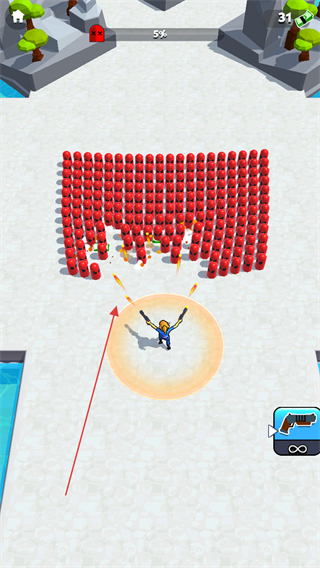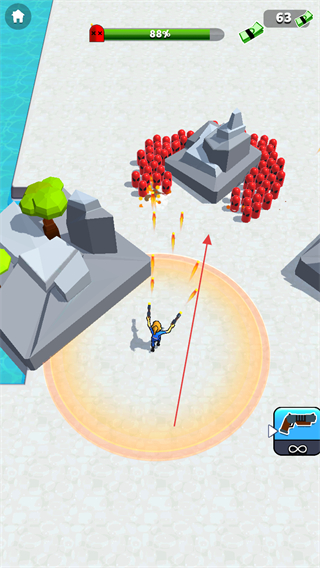 1、操控角色移動,接近紅色敵人集群時會自動射擊,消滅敵人以推進關卡進度如進度條從54%到88%再到100%。