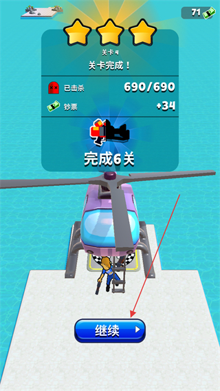 4、到達停機坪后,關卡完成,可查看已擊殺敵人數量、獲得的鈔票等信息,點擊繼續(xù)進入下一關,繼續(xù)挑戰(zhàn)。