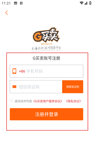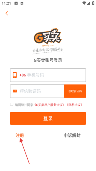 3、在登錄選擇頁面,點(diǎn)擊注冊可進(jìn)入G買賣賬號注冊頁面。